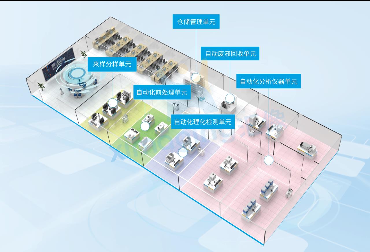整合高錳酸鹽指數檢測系統、智能總磷/總氮全自動檢測系統、智能氨氮全自動檢測系統。設置自動來樣、自動分樣、自動檢測、自動高壓消解、自動離心、自動稱重及自動耗材清洗回收回收功能區。